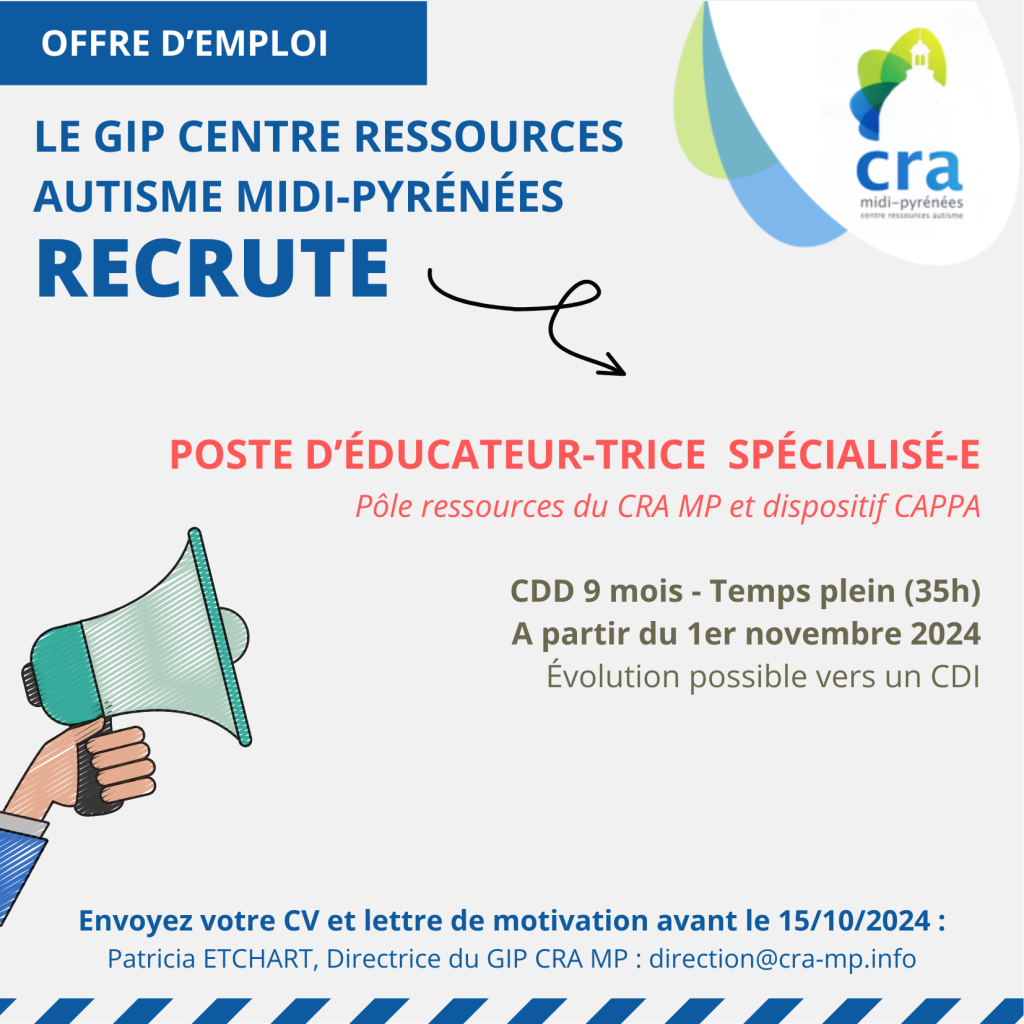 👉 Envoyez votre CV et lettre de motivation avant le 15/10/2024 : Patricia ETCHART, Directrice du GIP CRA MP : direction@cra-mp.info